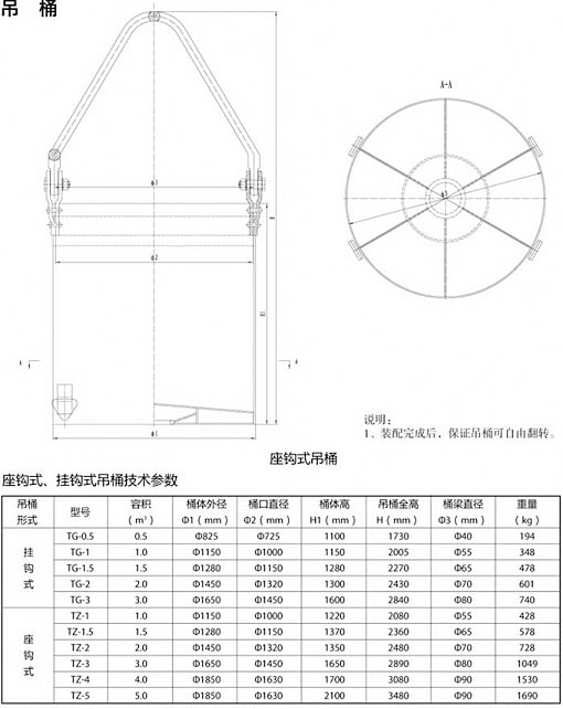 吊桶是立井井筒開鑿期間提升矸石、升降人員和材料的主要容器。當(dāng)井筒涌水量小于6m3/h時,還可作排水用,根據(jù)卸矸形式不同吊桶分為掛鉤式吊座鉤式吊桶。