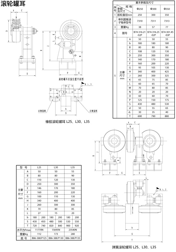 聚胺脂橡膠滾輪罐耳裝置(簡稱滾輪罐耳),是參考多年來各礦井使用滾輪罐耳的形式,廣泛吸取用戶的使用意見改進而成??筛鶕?jù)用戶的使用條件和要求,可采用橡膠緩沖、彈簧緩沖、碟簧緩沖、液壓緩沖、復合緩沖。其使用壽命長、安全可靠性高、維護方便等特點。