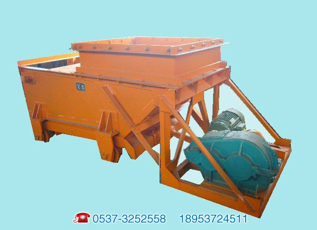 底板的兩則有側板,后面有斜板形成固定的槽壁。當底板向前運動時,底板上的物料借助于摩擦力的作用也隨之前進,底板后面的空間就被煤倉中落下的煤所填滿,底板后退時,被斜板擋住不能隨之后退,這樣底板前面的煤就被卸下,底板連續往復動作,煤就被一段一段地均勻地卸到運輸機或其他篩選設備上。