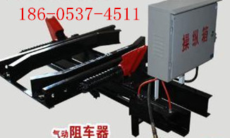 2、氣動抱軌式阻車器:主要由電控箱或氣控箱(含空氣過濾裝置)、雙阻車器主體、位置傳感器(或遙控器)等組成。該裝置以固定風源為動力,氣缸為動力執行部件,通過氣缸的伸縮來實現擋爪的開與關。