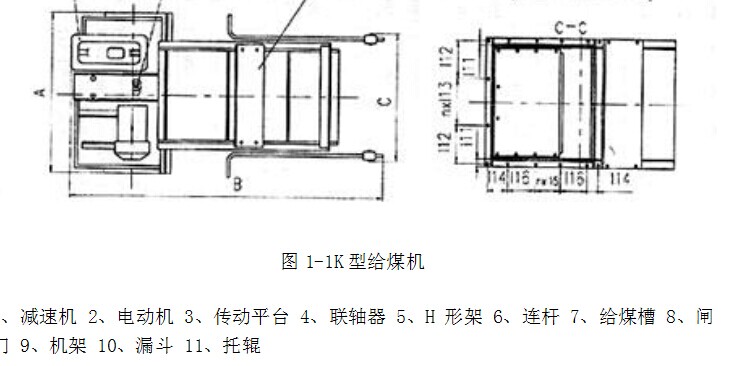 該機主要由電動機、減速器、曲拐、底托板、底托輪、后斜板、側板、弧形門、煤倉縮口聯接盤等組成。主要技術參數為:電動機功率:18.5kW;給煤量:132、268、395、530Ch。 該機使用中主要存在以下問題: