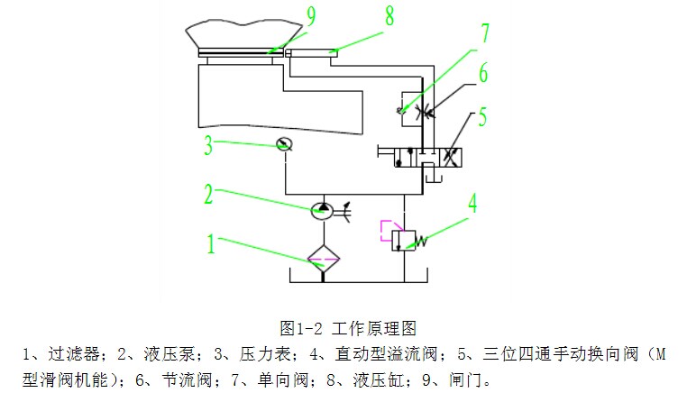 (1)針對防竄倉裝置工作特點,對系統方案擬定如下:①防竄倉裝置的組成。防竄倉裝置由液壓傳動系統,機械執行機構、電氣控制系統和傳感器組成。② 閘門快速關閉所需要的動力。 (2)設計時主要考慮以下幾點:①合理選擇液壓系統的參數,包括蓄能器的氣體常數,充液壓力,管路直徑和長度,可以使防竄倉裝置和閘門關閉時間控制在1 S以內。②蓄能器的氣體常數和充液壓力對系統的影響較大,如此值偏大,則液壓缸活塞的運動速度增長過快,加速度大,對系統沖擊也大;如此值偏小,則液壓缸活塞的運動速度增大過緩,且速度衰減也較快。③管路直徑對系統的性能影響最大,如管路直徑偏小,則管內液體的流速就大,運動阻力急劇增加,造成液壓缸活塞的運動加速度衰減過快,活塞運動速度上不去,影響閘門關閉時間。④在閘門關閉時間控制在1 S以內的技術指標下,管路長度可以滿足液壓動力裝置實際工程應用中靈活布置的要求。⑤ 閘門質量、轉動慣量的變化對系統的性能影響要很小。本液壓動力裝置能夠適應不同的往復式給煤機其閘門質量及轉動慣量變化的要求,具有一定的通用性。 1.2.2 工作原理